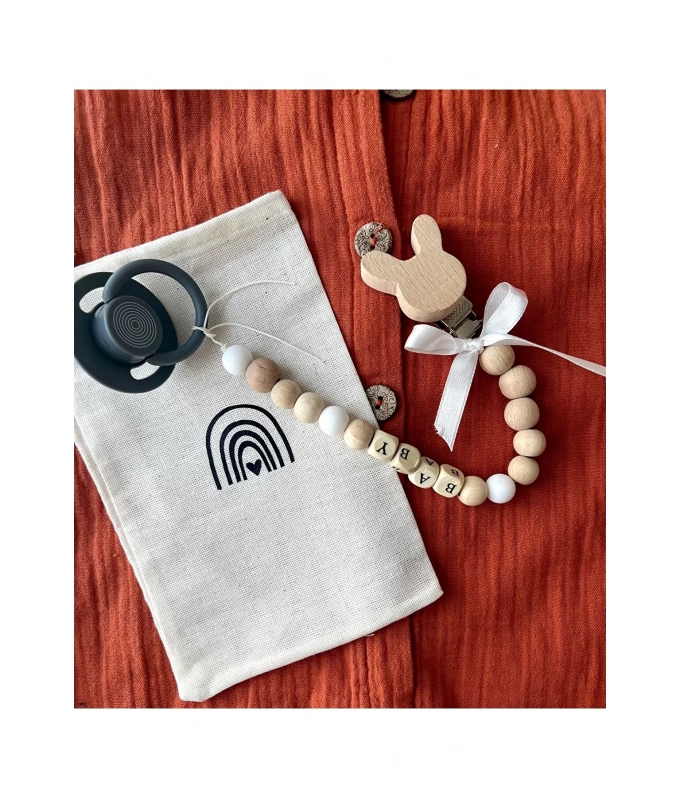 Dogal ahsap ve silikon boncuklu Bebek emzik zinciri ve desenli kesesi